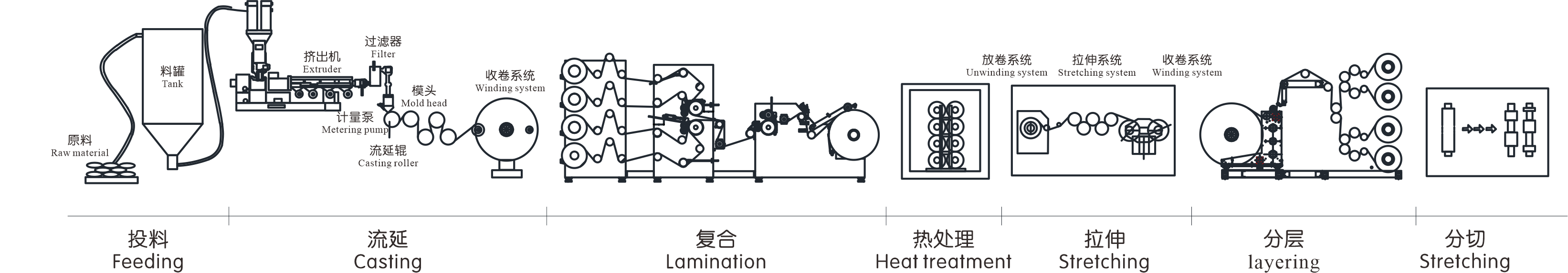 復(fù)合是將烘烤完成后的單層流延透明膜通過機器復(fù)合成多層的透明膜,主要是保證膜在拉伸線中不斷膜,提升拉伸效率